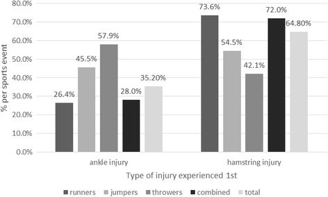 Methods: In an observational cohort study over 17 years (1998-2015), 367 elite track and field athletes, were grouped according to their first traumatic isolated ankle or hamstring injury. Fifty athletes experienced both injuries. The Mann-Whitney U and Chi-square tests (p < 0.05) were performed to test possible associations of ankle and hamstring injury with age, gender, athletics discipline, grade, and type of antecedent injury.