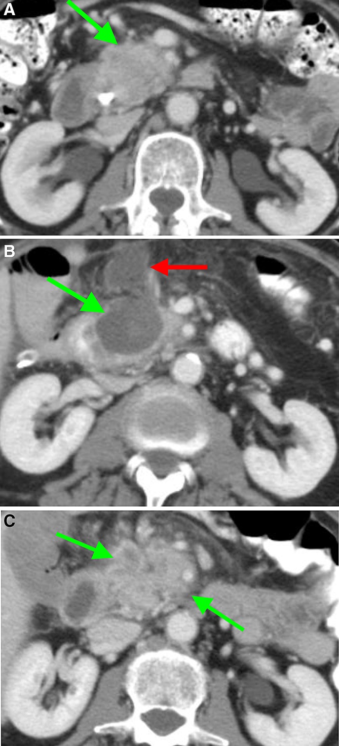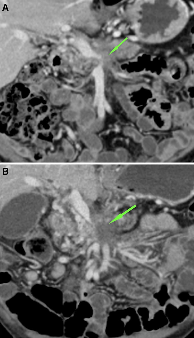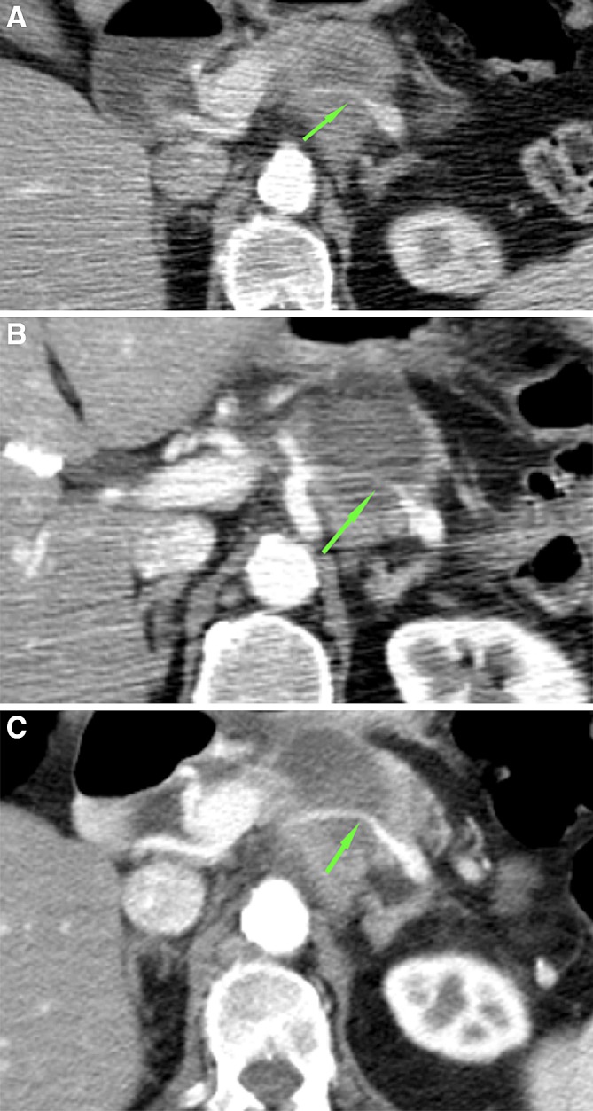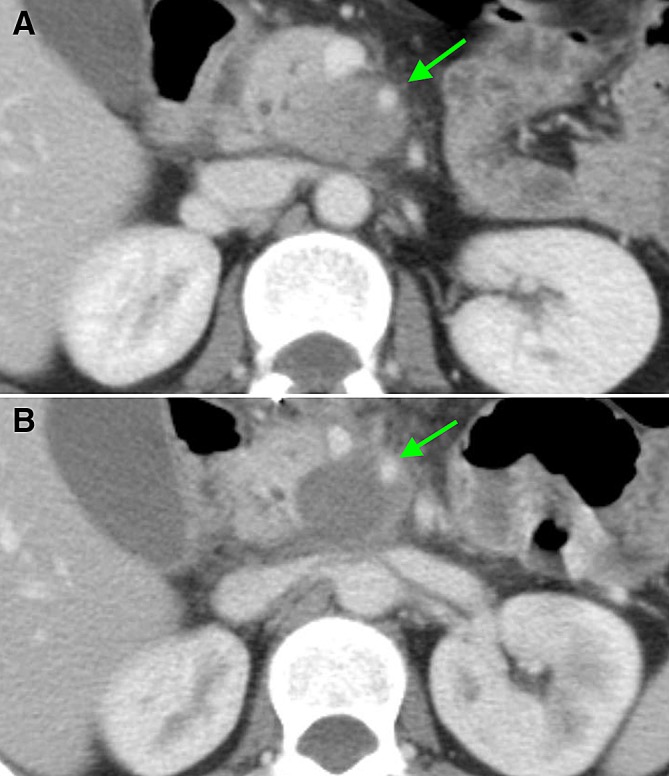 Conclusions: Directly after RFA for LAPC, a well-defined ablation zone is visible on CT-imaging. This ablation zone is usually replaced by tumor ingrowth after 3 months. Moreover, the ablation zone regularly included vascular structures, with rare asymptomatic venous occlusion or thrombosis and without adverse effects on arteries.