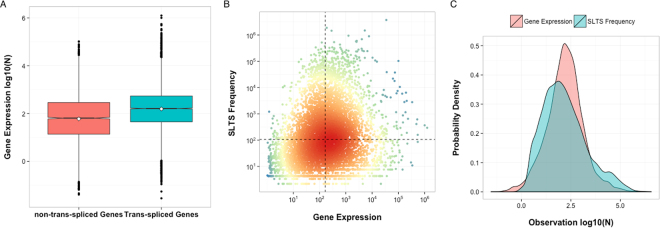 Spliced leader dependent trans-splicing (SLTS) has been described as an important RNA regulatory process that occurs in different organisms, including the trematode Schistosoma mansoni. We identified more than seven thousand putative SLTS sites in the parasite, comprising genes with a wide spectrum of functional classes, which underlines the SLTS as a ubiquitous mechanism in the parasite. Also, SLTS gene expression levels span several orders of magnitude, showing that SLTS frequency is not determined by the expression level of the target gene, but by the presence of particular gene features facilitating or hindering the trans-splicing mechanism. Our in-depth investigation of SLTS events demonstrates widespread alternative trans-splicing (ATS) acceptor sites occurring in different regions along the entire gene body, highlighting another important role of SLTS generating alternative RNA isoforms in the parasite, besides the polycistron resolution. Particularly for introns where SLTS directly competes for the same acceptor substrate with cis-splicing, we identified for the first time additional and important features that might determine the type of splicing. Our study substantially extends the current knowledge of RNA processing by SLTS in S. mansoni, and provide basis for future studies on the trans-splicing mechanism in other eukaryotes.