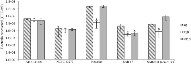 Staphylococcus aureus can develop a small colony variant (SCV) phenotype in response to sub-lethal exposure to the biocide triclosan. In the current study, whole genome sequencing was performed and changes in virulence were investigated in five Staphylococcus aureus strains following repeated exposure to triclosan. Following exposure, 4/5 formed SCV and exhibited point mutations in the triclosan target gene fabI with 2/4 SCVs showing mutations in both fabI and fabD. The SCV phenotype was in all cases immediately reversed by nutritional supplementation with fatty acids or by repeated growth in the absence of triclosan, although fabI mutations persisted in 3/4 reverted SCVs. Virulence, determined using keratinocyte invasion and Galleria mellonella pathogenicity assays was significantly (p < 0.05) attenuated in 3/4 SCVs and in the non-SCV triclosan-adapted bacterium. Proteomic analysis revealed elevated FabI in 2/3 SCV and down-regulation in a protein associated with virulence in 1/3 SCV. In summary, attenuated keratinocyte invasion and larval virulence in triclosan-induced SCVs was associated with decreases in growth rate and virulence factor expression. Mutation occurred in fabI, which encodes the main triclosan target in all SCVs and the phenotype was reversed by fatty acid supplementation, demonstrating an association between fatty acid metabolism and triclosan-induced SCV.