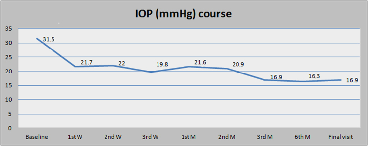 Results: Fourteen females and two males were included in the present study. The mean age (SD) of the patients was 43 (14) years. All individuals presented conjunctival injection and photophobia and developed bilateral transillumination defects, fixed mid-dilated pupils and pigment dispersion in the anterior chamber. Systemic antibiotics were previously prescribed in all cases (13 patients with moxifloxacin and three patients with clarithromycin) and the mean (SD) interval between onset of symptoms and antibiotic administration was 17 (4) days. Ocular hypertension complicated all eyes and required antiglaucoma medication in 25 eyes. Severe anterior chamber pigment dispersion and higher IOP during the first week after presentation was significantly associated with longer duration of ocular hypertension (OHT) (p = 0.019).