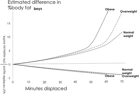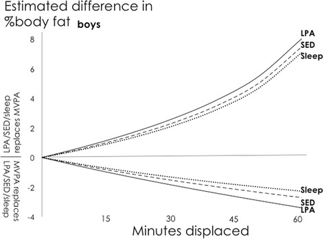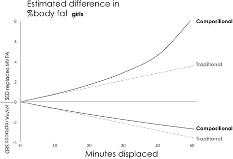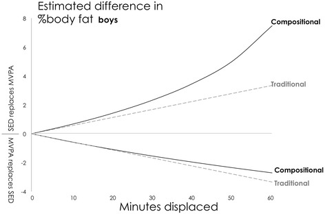 Results: Both compositional and traditional models estimated a positive (unfavourable) difference in body fat% when time was reallocated from MVPA to any other behaviour. Unlike traditional models, compositional models found the differences in estimated adiposity (1) were not necessarily symmetrical when an activity was being displaced, or displacing another (2) were not linearly related to the durations of time reallocated, and (3) varied depending on the starting composition.