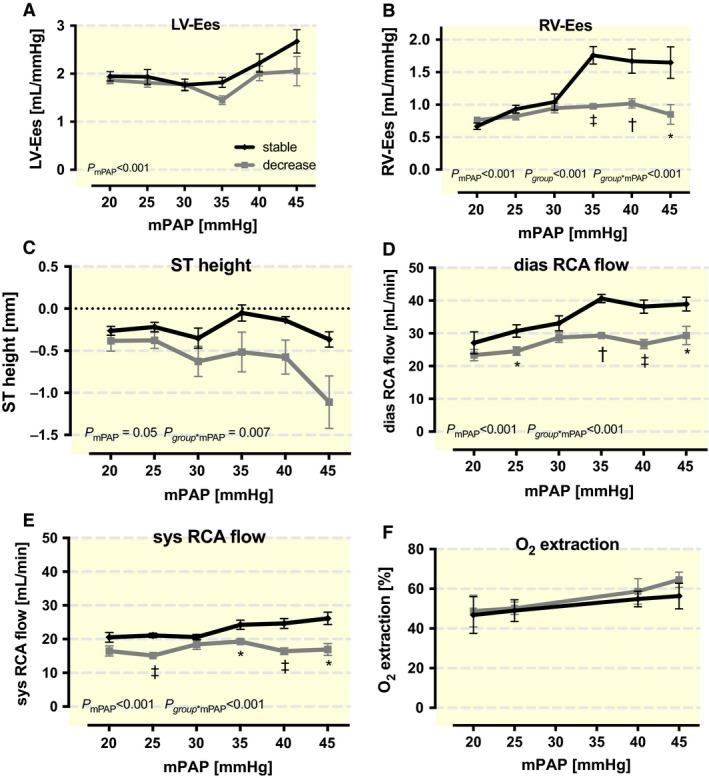 The extent of right ventricular compensation compared to the left ventricle is restricted and varies among individuals, which makes it difficult to define. While establishing a model of acute pulmonary hypertension in pigs we observed two different kinds of compensation in our animals. Looking deeper into the hemodynamic data we tried to delineate why some animals could compensate and others could not. Pulmonary hypertension (mean pressure 45 mmHg) was induced gradually by infusion of a stable thromboxane A2 analogue U46619 in a porcine model (n = 22). Hemodynamic data (pressure-volume loops, strain-analysis of echocardiographic data and coronary flow measurements) were evaluated retrospectively for the short-term right ventricular compensatory mechanisms and limits (Roehl et al. [2012] Acta Anaesthesiol. Scand., 56:449-58) 10 animals showed stable arterial blood pressures, whereas 12 pigs exhibited a significant drop of 16.4 ± 9.9 mmHg. Cardiac output and heart rate were comparable in both groups. In contrast, right ventricular contractility and coronary flow only rose in the stable group. The unchanging values in the decrease group correlated with an increasing ST-segment depression and a loss of ventricular synchronism and resulted in a larger septum bulging to the right ventricle. Simultaneously, a reduced left-ventricular end-diastolic volume and a missing improvement in contractility in the posterior septal and inferior free wall of the left ventricle have been observed. Our findings suggest that right ventricular compensation during acute pulmonary hypertension is strongly dependent on the individual capability to increase coronary flow. The cause for inter-individual variability could be the dimension and reactivity of the coronary system.