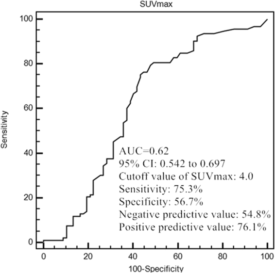 The quantitative relationship between iodine and glucose metabolism in metastases from differentiated thyroid cancer (DTC) remains unknown. Aim of the prospective study was to establish the value of 18F-FDG PET/CT in predicting 131I-avidity of metastases from DTC before the first radioiodine therapy. A total of 121 postoperative DTC patients with elevated stimulated serum thyroglobulin (ssTg) who underwent 131I adjuvant therapy or therapy after 18F-FDG PET/CT scan were enrolled. The Receiver operating characteristic curve was established to create an optimal cut-off point and evaluate the value of SUVmax for predicting 131I-avidity. In our study, the median SUVmax in 131I-nonavid metastatic target lesions was also significantly higher than that in 131I-avid metastatic target lesions (5.37 vs. 3.30; P = 0.000). At a cut-off value of 4.0 in SUVmax, the area under curve was 0.62 with the sensitivity, specificity, positive predictive value and negative predictive value of 75.3%, 56.7%, 76.1%, and 54.8%, respectively. These results suggest that 18F-FDG PET/CT may be of great value in identifying metastases in postoperative DTC patients with elevated ssTg before 131I administration, leading to an improved management of disease. 18F-FDG positive metastatic DTC with SUVmax of greater than 4.0 possesses higher probability of non-avidity to radioiodine.