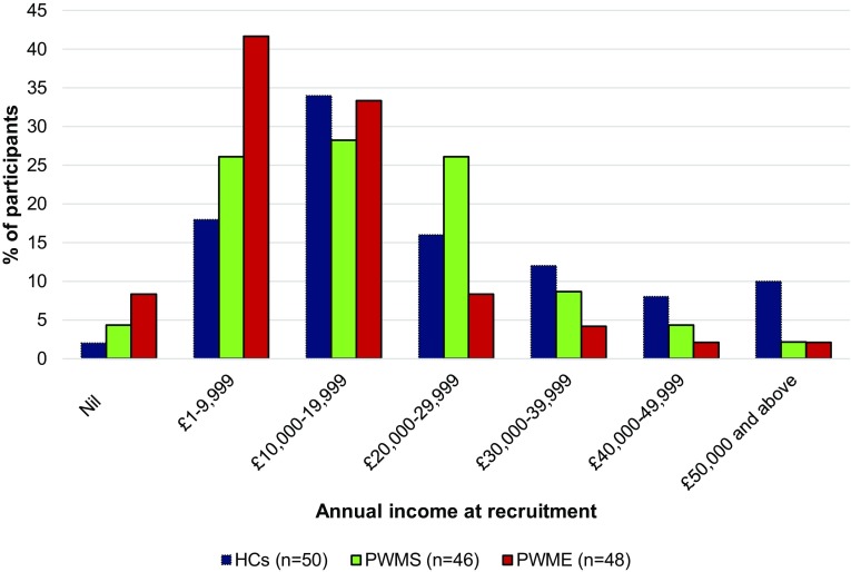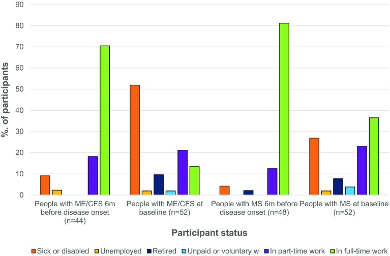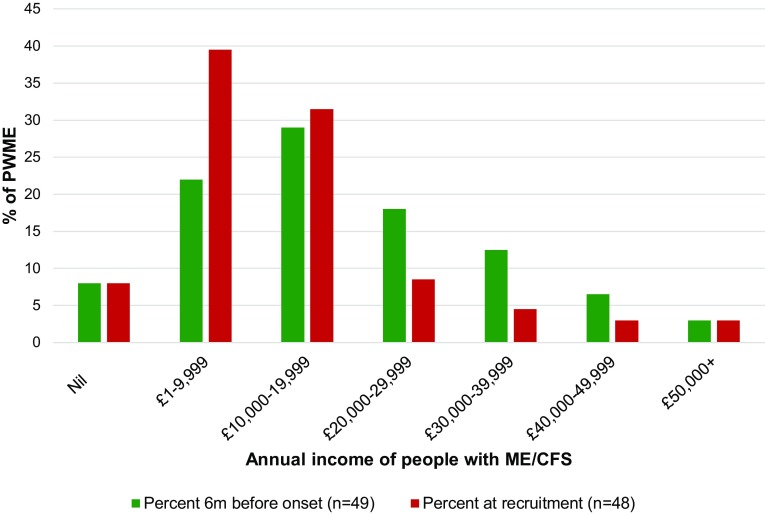 Methods: In this cross-sectional study, we used data collected as part of the UK ME/CFS Biobank to compare actual participant scores from the Medical Outcomes Survey Short Form-36 v2™ (SF-36v2™) between groups, as a proxy for impact of disability, and from a bespoke questionnaire seeking data on employment and income.