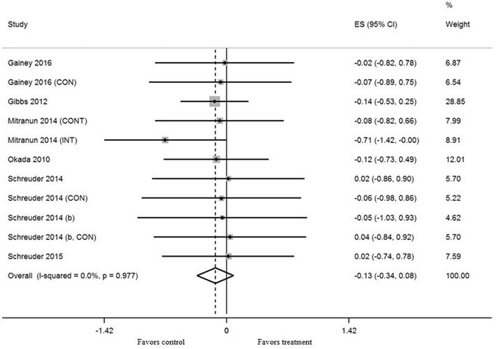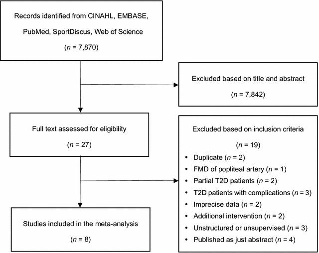 Methods: Five electronic databases were searched (until June 2017) for studies that met the following criteria: (i) randomized controlled trials; (ii) T2D aged ≥ 18 years; (iii) measured EF by brachial artery flow-mediated dilation (FMD); (iv) structured and supervised exercise intervention for ≥ 8 weeks.