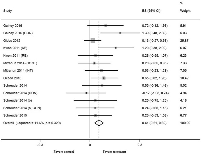 Results: Thirteen cohorts, selected from eight studies (306 patients, average age 59 years), met the inclusion criteria. Exercise training significantly increased FMD (mean ES = 0.41, 95% CI 0.21-0.62, P < 0.001). Low to moderate intensity subgroups and aerobic exercise (AE) subgroups significantly increased FMD more than moderate to high intensity subgroups and combined AE and resistance exercise subgroups respectively (P < 0.01, P < 0.05). The Grading of Recommendations Assessment, Development and Evaluation (GRADE) assessments reported that quality of evidence for all outcomes was moderate except shear rate showing low. Egger's test showed no significant publication bias for all outcomes.
