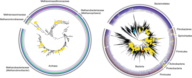 Productivity of ruminant livestock depends on the rumen microbiota, which ferment indigestible plant polysaccharides into nutrients used for growth. Understanding the functions carried out by the rumen microbiota is important for reducing greenhouse gas production by ruminants and for developing biofuels from lignocellulose. We present 410 cultured bacteria and archaea, together with their reference genomes, representing every cultivated rumen-associated archaeal and bacterial family. We evaluate polysaccharide degradation, short-chain fatty acid production and methanogenesis pathways, and assign specific taxa to functions. A total of 336 organisms were present in available rumen metagenomic data sets, and 134 were present in human gut microbiome data sets. Comparison with the human microbiome revealed rumen-specific enrichment for genes encoding de novo synthesis of vitamin B12, ongoing evolution by gene loss and potential vertical inheritance of the rumen microbiome based on underrepresentation of markers of environmental stress. We estimate that our Hungate genome resource represents ∼75% of the genus-level bacterial and archaeal taxa present in the rumen.