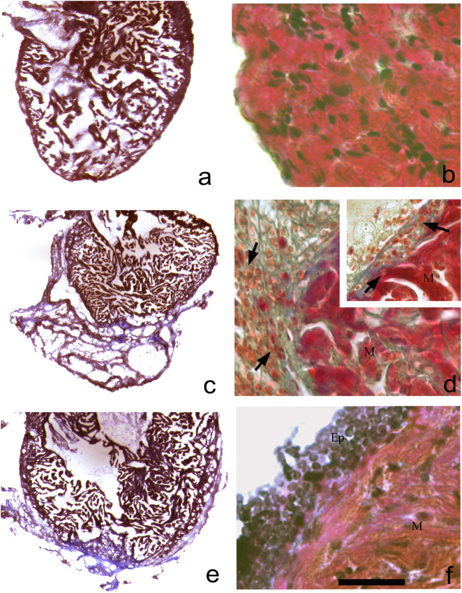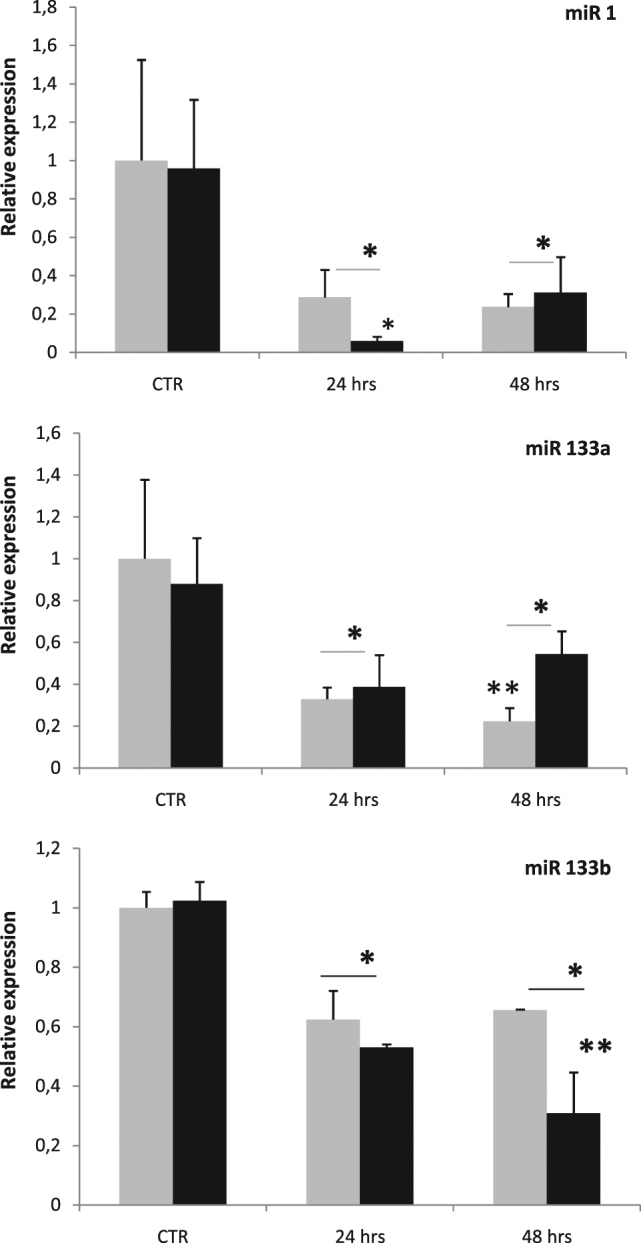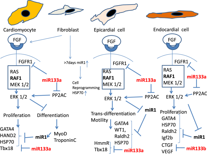 Zebrafish could be an interesting translational model to understand and improve the post-infarction trial and possible regeneration in humans. The adult zebrafish is able to regenerate efficiently after resecting nearly 20% of the ventricular apex. This process requires the concert activation of the epicardium and endocardium, as well as trans-differentiation of pre-existing cardiomyocytes that together replace the lost tissue. The molecular mechanisms involved in this activation process are not completely clarified. In this work, in order to investigate if the downregulation of these miRNAs (miRs) are linked with the activation of epicardium, the expressions of miR-133a, b and miR-1 during regeneration were analysed. qPCR analyses in whole-heart, or from distinct dissected epicardial cells comparing to regenerative clot (containing cardiomyocytes, fibroblasts and endocardial cells) by a laser-micro-dissector, have indicated that already at 24 h there is a downregulation of miRs: (1) miR-133a and miR-1 in the epicardium and (2) miR-133b and miR-1 in the regenerative clot. All the miRs remain downregulated until 7 days post-surgery. With the aim to visualize the activations of heart component in combination with miRs, we developed immunohistochemistry using antibodies directed against common markers in mammals as well as zebrafish: Wilms tumour 1 (WT1), a marker of epicardium; heat-shock protein 70 (HSP70), a chaperon activated during regeneration; and the Cardiac Troponin T (cTnT), a marker of differentiated cardiomyocytes. All these markers are directly or indirectly linked to the investigated miRs. WT1 and HSP70 strongly marked the regeneration site just at 2-3 days postventricular resection. In coherence, cTnT intensively marked the regenerative portion from 7 days onwards. miRs-1 and -133 (a,b) have been strongly involved in the activation of epicardium and regenerative clot during the regeneration process in zebrafish. This study can be a useful translational model to understand the early epicardial activation in which miRs-133a and miR-1 seem to play a central role as observed in the human heart.