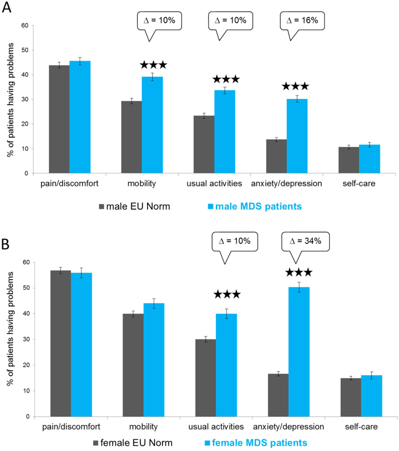 In myelodysplastic syndromes (MDS), health-related quality of life (HRQoL) represents a relevant patient-reported outcome, which is essential in individualized therapy planning. Prospective data on HRQoL in lower-risk MDS remain rare. We assessed HRQOL by EQ-5D questionnaire at initial diagnosis in 1690 consecutive IPSS-Low/Int-1 MDS patients from the European LeukemiaNet Registry. Impairments were compared with age- and sex-matched EuroQol Group norms. A significant proportion of MDS patients reported moderate/severe problems in the dimensions pain/discomfort (49.5%), mobility (41.0%), anxiety/depression (37.9%), and usual activities (36.1%). Limitations in mobility, self-care, usual activities, pain/discomfort, and EQ-VAS were significantly more frequent in the old, in females, and in those with high co-morbidity burden, low haemoglobin levels, or red blood cells transfusion need (p < 0.001). In comparison to age- and sex-matched peers, the proportion of problems in usual activities and anxiety/depression was significantly higher in MDS patients (p < 0.001). MDS-related restrictions in the dimension mobility were most prominent in males, and in older people (p < 0.001); in anxiety/depression in females and in younger people (p < 0.001); and in EQ-VAS in women and in persons older than 75 years (p < 0.05). Patients newly diagnosed with IPSS lower-risk MDS experience a pronounced reduction in HRQoL and a clustering of restrictions in distinct dimensions of HRQoL as compared with reference populations.