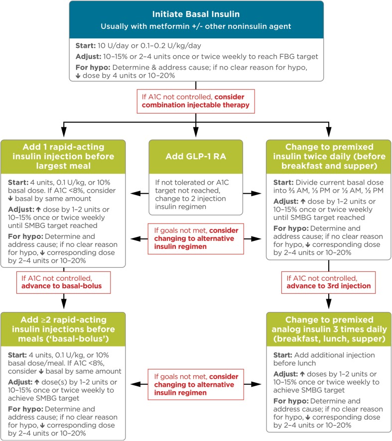 As the number of people living with type 2 diabetes (T2D) continues to rise, managing their complex needs presents an increasing challenge to physicians. While treatment guidelines provide evidence-based guidance, they are not prescriptive-rather they emphasize individualization of management based on a patient's clinical needs and preferences. Physicians, therefore, need to be fully aware of the advantages and disadvantages of the multiple and increasing treatment options available to them at each stage of the disease. The progressive nature of T2D means that treatment with basal insulin will become inevitable for many patients, while for some patients basal insulin alone will eventually be insufficient for maintaining glycemic targets. Recent guidelines recommend two basic approaches for intensifying basal insulin: the use of rapid-acting insulin, either as additional prandial injections or as part of premix (biphasic) insulin; and the addition of glucagon-like peptide-1 receptor agonists (GLP-1 RAs) to the insulin therapy, which can be administered via subcutaneous injection once or twice daily, or weekly depending on formulation. More recently, two fixed-ratio combinations of basal insulin and a GLP-1 RA that allow for once-daily dosing have been approved. Each of these approaches has potential benefits and drawbacks, particularly in terms of risk for hypoglycemia, weight change, convenience, and side effects. Understanding these differences is central to guiding patient and physician choice. This article discusses the rationale, advantages, disadvantages, and implementation of currently available strategies for basal insulin treatment intensification in patients with T2D.