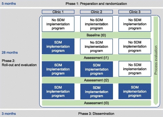 Methods: We use a stepped wedge design, a variant of the cluster randomized controlled trial. The intervention to be implemented is SDM. Three participating clinics of one comprehensive cancer center will be randomized and receive the multicomponent SDM implementation program in a time-delayed sequence. The program consists of the following strategies: (a) SDM training for health care professionals, (b) individual coaching for physicians, (c) patient activation strategy, (d) provision of patient information material and decision aids, (e) revision of the clinics' quality management documents, and (f) critical reflection of current organization of multidisciplinary team meetings. We will conduct a mixed methods outcome and process evaluation. The outcome evaluation will consist of four measurement points. The primary outcome is adoption of SDM, measured by the 9-item Shared Decision Making Questionnaire. A range of other implementation outcomes will be assessed (i.e., acceptability, readiness for implementing change, appropriateness, penetration). The implementation process will be evaluated using stakeholder interviews and field notes. This will allow adapting interventions if necessary.