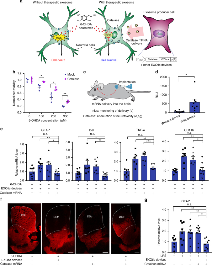 Exosomes are cell-derived nanovesicles (50-150 nm), which mediate intercellular communication, and are candidate therapeutic agents. However, inefficiency of exosomal message transfer, such as mRNA, and lack of methods to create designer exosomes have hampered their development into therapeutic interventions. Here, we report a set of EXOsomal transfer into cells (EXOtic) devices that enable efficient, customizable production of designer exosomes in engineered mammalian cells. These genetically encoded devices in exosome producer cells enhance exosome production, specific mRNA packaging, and delivery of the mRNA into the cytosol of target cells, enabling efficient cell-to-cell communication without the need to concentrate exosomes. Further, engineered producer cells implanted in living mice could consistently deliver cargo mRNA to the brain. Therapeutic catalase mRNA delivery by designer exosomes attenuated neurotoxicity and neuroinflammation in in vitro and in vivo models of Parkinson's disease, indicating the potential usefulness of the EXOtic devices for RNA delivery-based therapeutic applications.