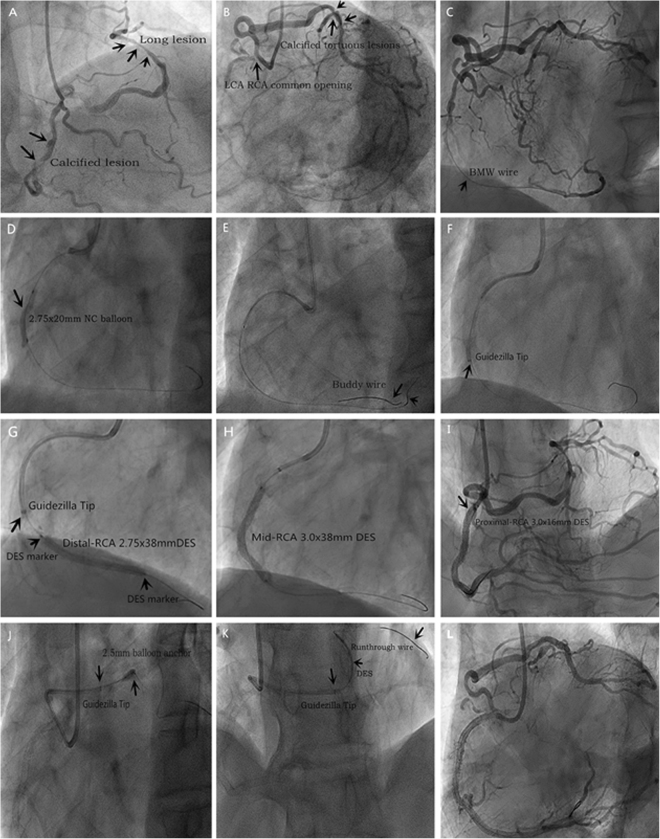 Anatomic variations, calcified, tortuous, angulated lesions, and lack of support to increase the complexity of transradial intervention (TRI). Guidezilla is a mother-and-child catheter enabling increased support during complex interventions. As there are few published reports of its use, we describe our experience using this device to assist TRI in Chinese patients. The aim of this study was to investigate the efficacy and safety of the Guidezilla guide extension catheter in complex coronary interventions. Thirty-two patients' clinical characteristics, angiographic details, and in-hospital outcome retrospectively collected between June 2015 and August 2017. Patients were 59.44 ± 10.48 years of age and 26 (81%) were men. The most frequent target vessels were the RCA (34%) and LAD (31%), patients had complex type C (53%) or B (47%) lesions, severely tortuous (41%) and angulated (22%).With the use of Guidezilla, technique success was 100%, and procedural success was 94%. The mean diameter of the deployed stents was 2.97 ± 0.37 mm, and the length was 27.19 ± 8.14 mm. The estimated mean distance of Guidezilla intubation into the target vessel was 7.66 ± 2.29 cm.The Guidezilla catheter extension safely facilitated successful completion of TRI in complex coronary artery lesions. This device can help interventionalists successfully perform difficult procedures.