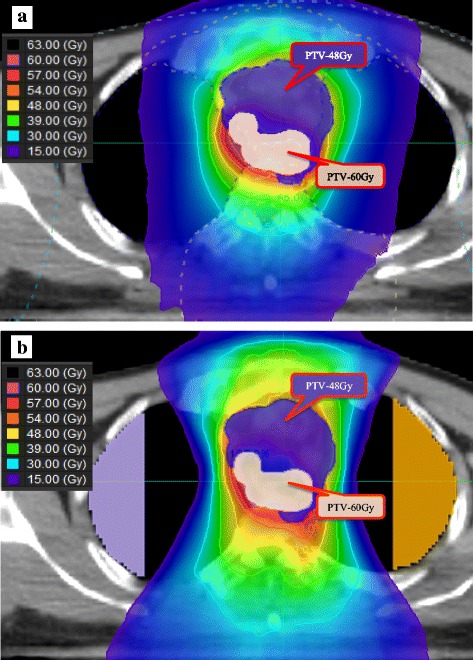 Methods: Fifteen patients with CEC were analysed. The primary/nodal lesion and prophylactic nodal region with adequate margins were defined as the planning target volume (PTV)-60 Gy and PTV-48 Gy, respectively. Nineteen plans per patient were made and compared (total: 285 plans), including non-block and block plans with several shapes and sizes.
