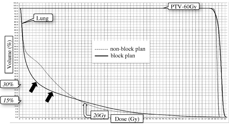Results: The most appropriate block model was semi-circular, 8 cm outside of the tracheal bifurcation, with a significantly lower lung dose compared to that of non-block plans; the mean lung volumes receiving 5 Gy, 10 Gy, 20 Gy, and the mean lung dose were 31.3% vs. 48.0% (p < 0.001), 22.4% vs. 39.4% (p < 0.001), 13.2% vs. 16.0% (p = 0.028), and 7.1 Gy vs. 9.6 Gy (p < 0.001), respectively. Both the block and non-block plans were comparable in terms of the homogeneity and conformity indexes of PTV-60 Gy: 0.05 vs. 0.04 (p = 0.100) and 0.82 vs. 0.85 (p = 0.616), respectively. The maximum dose of the spinal cord planning risk volume increased slightly (49.4 Gy vs. 47.9 Gy, p = 0.002). There was no significant difference in the mean doses to the heart and the thyroid gland. Prolongation of the delivery time was less than 1 min (5.6 min vs. 4.9 min, p = 0.010).