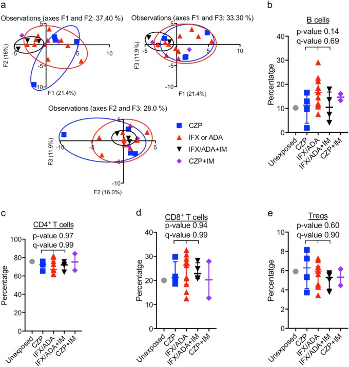 Results: Percentages of B cells, CD4+ T helper cells, T regulatory cells (Tregs), and CD8+ cytotoxic T cells, were similar among the groups. Infants exposed to combination therapy (IFX/ADA + IM) exhibited trends toward fewer CD27+ B cells, switched memory B cells, plasmablasts, interferon gamma (IFNγ)-producing CD4+ and CD8+ T cells, and CCR5+CD4+ T cells, but these did not reach statistical significance.
