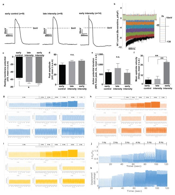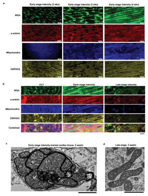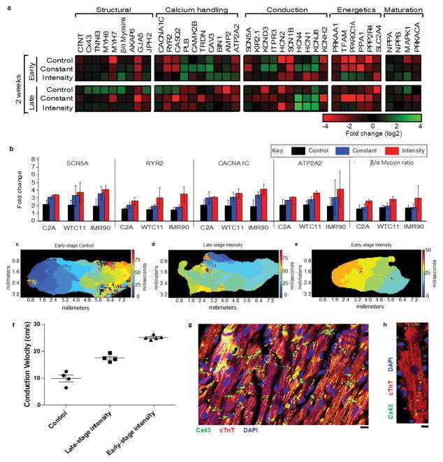 Cardiac tissues generated from human induced pluripotent stem cells (iPSCs) can serve as platforms for patient-specific studies of physiology and disease1-6. However, the predictive power of these models is presently limited by the immature state of the cells1, 2, 5, 6. Here we show that this fundamental limitation can be overcome if cardiac tissues are formed from early-stage iPSC-derived cardiomyocytes soon after the initiation of spontaneous contractions and are subjected to physical conditioning with increasing intensity over time. After only four weeks of culture, for all iPSC lines studied, such tissues displayed adult-like gene expression profiles, remarkably organized ultrastructure, physiological sarcomere length (2.2 µm) and density of mitochondria (30%), the presence of transverse tubules, oxidative metabolism, a positive force-frequency relationship and functional calcium handling. Electromechanical properties developed more slowly and did not achieve the stage of maturity seen in adult human myocardium. Tissue maturity was necessary for achieving physiological responses to isoproterenol and recapitulating pathological hypertrophy, supporting the utility of this tissue model for studies of cardiac development and disease.