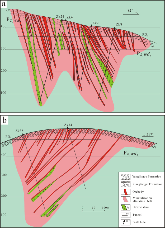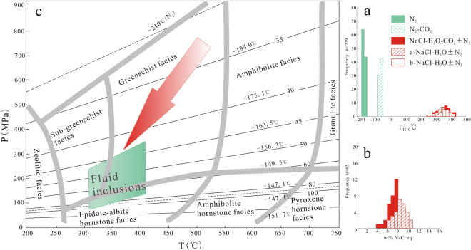 Nearly pure N2 fluid inclusions (Th (L) = -151~-168 °C; Th (V) = ~150.3 °C) were identified in W-mineralized quartz veins from the Yangjingou scheelite deposit, in the eastern Yanbian area, NE China. Other fluid inclusion populations include N2-CO2, NaCl-H2O ± N2 and CO2 ± N2-NaCl-H2O, but no hydrocarbons were detected. The host rocks are part of the Wudaogou Group metamorphic series, which mainly consist of Ca-rich mica schist. Subhedral sulfide minerals occur in early disseminated W-mineralized quartz veins, or have partially replaced early scheelite. ThN2 and ThN2-H2O indicate N2 fluid-trapping from 315 °C to 410 °C and from 80 MPa to 350 MPa. Oxygen and hydrogen isotopic data (δD = -74.9‰~-77‰, δ18O = 9.6‰~12‰, V-SMOW) suggest that the mineralizing fluids were composed of mixed magmatic and metamorphic water, N2-rich inclusions (δ15N = -0.5‰ to 1.4‰) indicate fluid-rock interaction with metamorphic rocks. The N2-rich fluid was closely associated with scheelite precipitation. During thermal decomposition under high oxygen fugacity conditions, which occurred synchronously with metamorphism and magmatic activity, large amounts of N2 were liberated from NH4+-micas, which then accumulated in the parent fluid of the quartz scheelite veins.