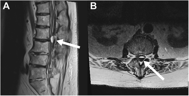 Discussion: This case represents the first report of an AS patient who developed a subdural hematoma requiring evacuation. Although rare, the clinician should maintain a broad differential and be familiar with this unique pathology, particularly in high-risk patients, such as those with suspected fractures or on warfarin. In patients with back pain and myelopathic symptoms, rapid diagnosis followed by prompt evacuation allows for the best opportunity for neurologic recovery.