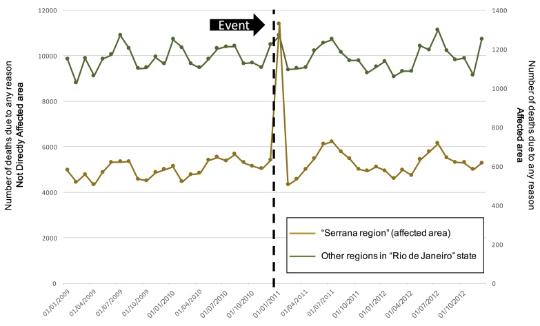 INTRODUCTION In January 2011 landslides and floods followed heavy rain in the Mountainous Region of Rio de Janeiro State ("Região Serrana"), in southeastern Brazil. These events led to the largest disaster registered in Brazilian recent history. Few studies addressed the impacts of this disaster on public health, and we found none addressing the impact on mental health. This study reviewed the consequences of the 2011 disaster in the "Região Serrana", by comparing the demand for public mental health assistance data from time periods before and after the even METHODS We performed an ecologic study, analysing the aggregate data from "Região Serrana" during the period two years before and after the disaster, exporting data from the Brazilian open access public health database. The primary outcome was defined as Mental Health Care Demand, and for that we calculated the number of mental health care visits per month, the proportion of visits due to mental health care and the monthly absolute number of mental health care visits per CAPS - "Centro de Atenção Psicossocial" (Psychosocial Care Centre). For secondary outcomes we evaluated the total number of deaths by any reason, and the total number of hospitalizations. The other health administrative regions of Rio de Janeiro state were used as control group. RESULTS We observed that there was an important increase in the rate of visits due to mental health in the six months after the landslides, from 13,875 to 17,690, reaching its maximum one year after the event totalizing 21,980 visits (Dec 2011). It was also observed that the proportion of visits due to mental health disorders increased after the event in the "Região Serrana", as well as the number of mental health care visits per CAPS. DISCUSSION In conclusion, we observed that the 2011 Landslides in "Região Serrana" led to a sustained higher burden to public mental health care. There was an increase in the demand for mental health visits, and the ratio of visits per CAPS was higher during most part of the studied period after the event, even with the region having more CAPS than before.