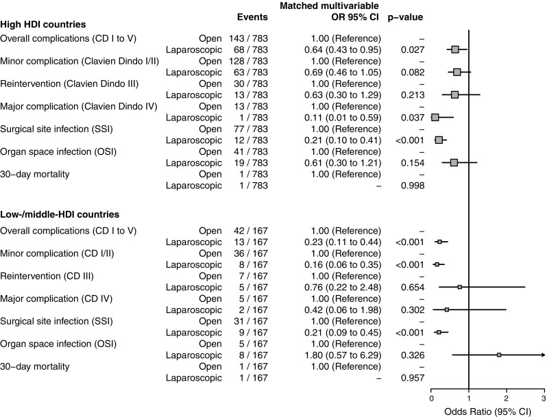 Results: 4546 patients from 52 countries underwent appendectomy (2499 high-, 1540 middle-, and 507 low-HDI groups). Surgical site infection (SSI) rates were higher in low-HDI (OR 2.57, 95% CI 1.33-4.99, p = 0.005) but not middle-HDI countries (OR 1.38, 95% CI 0.76-2.52, p = 0.291), compared with high-HDI countries after adjustment. A laparoscopic approach was common in high-HDI countries (1693/2499, 67.7%), but infrequent in low-HDI (41/507, 8.1%) and middle-HDI (132/1540, 8.6%) groups. After accounting for case-mix, laparoscopy was still associated with fewer overall complications (OR 0.55, 95% CI 0.42-0.71, p < 0.001) and SSIs (OR 0.22, 95% CI 0.14-0.33, p < 0.001). In propensity-score matched groups within low-/middle-HDI countries, laparoscopy was still associated with fewer overall complications (OR 0.23 95% CI 0.11-0.44) and SSI (OR 0.21 95% CI 0.09-0.45).