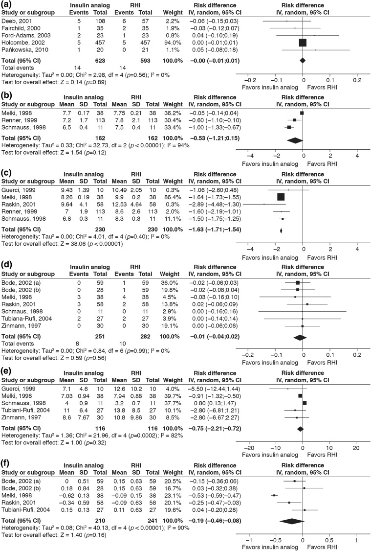 Results: In people on CSII, rapid-acting insulin analogs lowered postprandial plasma glucose post-breakfast to a greater extent than did regular human insulin (RHI) (mean difference: - 1.63 mmol/L [95% confidence interval - 1.71; - 1.54]), with a comparable risk of hypoglycemia and a trend for lower glycated hemoglobin. In the pediatric population, glycemic control was similar with rapid-acting insulin analogs and RHI, with no safety concerns. Meta-analysis indicated severe hypoglycemic events were comparable for rapid-acting insulin analogs versus RHI (risk difference: 0.00 [95% confidence interval - 0.01; 0.01]). In the pregnancy group, insulin lispro and insulin aspart were safe and effective for both mother and fetus, with glycemic control being at least as good as with RHI. There were no data on insulin glulisine during pregnancy.