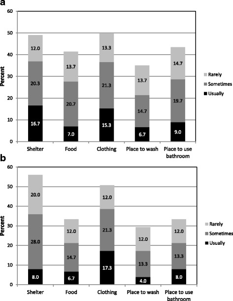 Methods: We conducted a survey of homeless smokers (N = 306) in 4/2014-7/2014 and a pilot randomized controlled trial (RCT) for homeless smokers (N = 75) in 10/2015-6/2016 at Boston Health Care for the Homeless Program. In both studies, subsistence difficulties were characterized as none, low, or high based on responses to a 5-item scale assessing the frequency of past-month difficulty finding shelter, food, clothing, a place to wash, and a place to go to the bathroom. Among survey participants, we used linear regression to assess the associations between subsistence difficulty level and readiness to quit, confidence to quit, and a composite measure of perceived barriers to quitting. Among RCT participants, we used repeated-measures logistic regression to examine the association between baseline subsistence difficulty level and carbon monoxide-defined brief smoking abstinence assessed 14 times over 8 weeks of follow-up. Analyses adjusted for demographic characteristics, substance use, mental illness, and nicotine dependence.