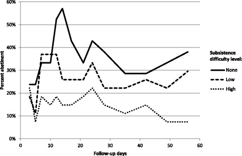 Results: Subsistence difficulties were common in both study samples. Among survey participants, greater subsistence difficulties were associated with more perceived barriers to quitting (p < 0.001) but not with cessation readiness or confidence. A dose-response relationship was observed for most barriers, particularly psychosocial barriers. Among RCT participants, greater baseline subsistence difficulties predicted less smoking abstinence during follow-up in a dose-response fashion. In adjusted analyses, individuals with the highest level of subsistence difficulty had one-third the odds of being abstinent during follow-up compared to those without subsistence difficulties (OR 0.33, 95% CI 0.11-0.93) despite making a similar number of quit attempts.