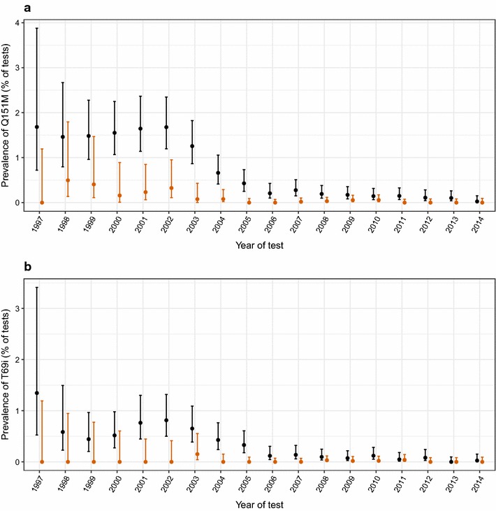 Conclusions: The Q151M and T69i resistance mutations are now very rare in the UK. Our results suggest that good outcomes are possible for people with these mutations. However, in this historic sample, viral load and CD4 at detection were important factors in determining prognosis.