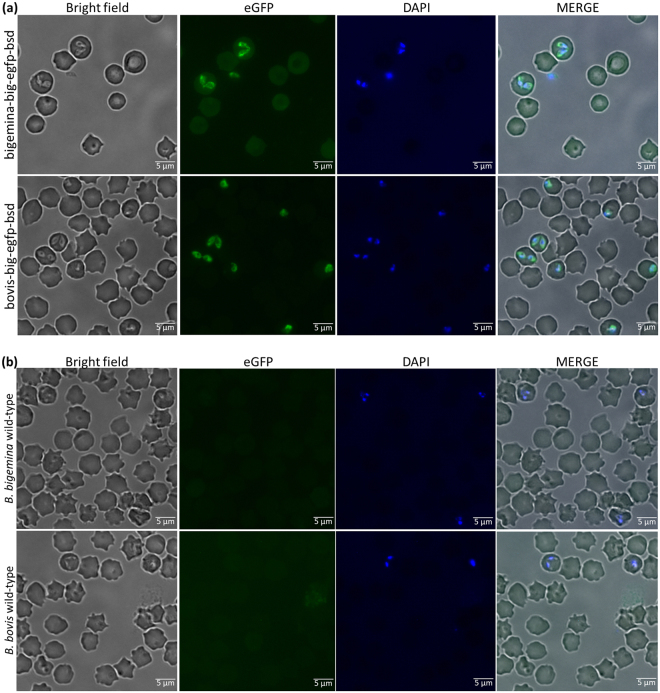 Babesia bigemina and Babesia bovis, are the two major causes of bovine babesiosis, a global neglected disease in need of improved methods of control. Here, we describe a shared method for the stable transfection of these two parasites using electroporation and blasticidin/blasticidin deaminase as a selectable marker. Stably transfected B. bigemina and B. bovis were obtained using a common transfection plasmid targeting the enhanced green fluorescent protein-BSD (egfp-bsd) fusion gene into the elongation factor-1α (ef-1α) locus of B. bigemina and B. bovis under the control of the B. bigemina ef-1α promoter. Sequencing, Southern blotting, immunoblotting and immunofluorescence analysis of parasite-infected red blood cells, demonstrated that the egfp-bsd gene was expressed and stably integrated solely into the ef-1α locus of both, B. bigemina and B. bovis. Interestingly, heterologous B. bigemina ef-1α sequences were able to drive integration into the B. bovis genome by homologous recombination, and the stably integrated B. bigemina ef-1α-A promoter is fully functional in B. bovis. Collectively, the data provides a new tool for genetic analysis of these parasites, and suggests that the development of vaccine platform delivery systems based on transfected B. bovis and B. bigemina parasites using homologous and heterologous promoters is feasible.