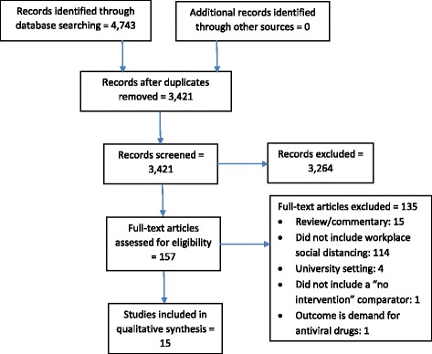 Background: Social distancing is one of the community mitigation measures that may be recommended during influenza pandemics. Social distancing can reduce virus transmission by increasing physical distance or reducing frequency of congregation in socially dense community settings, such as schools or workplaces. We conducted a systematic review to assess the evidence that social distancing in non-healthcare workplaces reduces or slows influenza transmission.