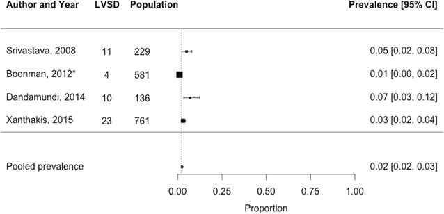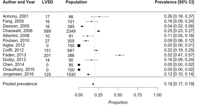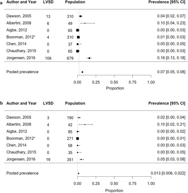 Results: The pooled prevalence of LVSD was higher in hospital populations (13 studies, n = 5835, 18% [95% CI 17-19%]), than in the general population (4 studies, n = 1707, 2% [95% CI 2-3%]). Seven studies in total reported sex-stratified prevalence estimates (men: 7% [95% CI 5-8%] vs. women: 1.3% [95% CI 0.0.2.2%]). The prevalence of HFrEF was available in one general population study (5.8% [95% CI 3.7.6%], men: 6.8% vs. women: 3.0%).