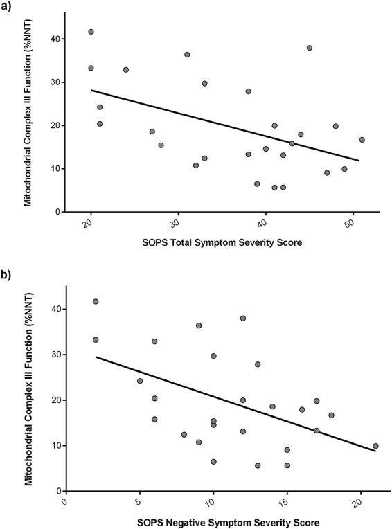 Alterations in mitochondrial function have been implicated in the etiology of schizophrenia. Most studies have investigated alterations in mitochondrial function in patients in which the disorder is already established; however, whether mitochondrial dysfunction predates the onset of psychosis remains unknown. We measured peripheral mitochondrial complex (I-V) function and lactate/pyruvate levels in 27 antipsychotic-naïve individuals at clinical high risk for psychosis (CHR) and 16 healthy controls. We also explored the association between mitochondrial function and brain microglial activation and glutathione levels using a translocator protein 18 kDa [18F]FEPPA PET scan and 1H-MRS scan, respectively. There were no significant differences in mitochondrial complex function and lactate/pyruvate levels between CHR and healthy controls. In the CHR group, mitochondrial complex III function (r = -0.51, p = 0.008) and lactate levels (r = 0.61, p = 0.004) were associated with prodromal negative symptoms. As previously reported, there were no significant differences in microglial activation and glutathione levels between groups, however, mitochondrial complex IV function was inversely related to microglial activation in the hippocampus in CHR (r = -0.42, p = 0.04), but not in healthy controls. In conclusion, alterations in mitochondrial function are not yet evident in CHR, but may relate to the severity of prodromal symptoms, particularly negative symptoms.