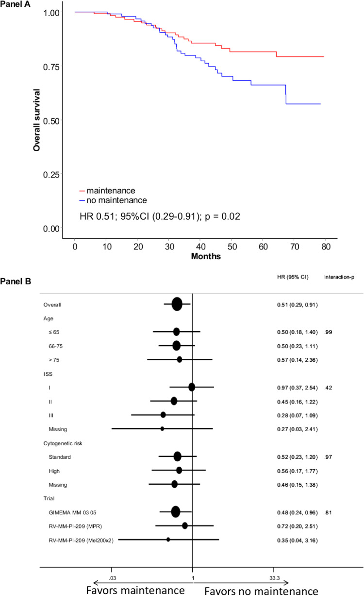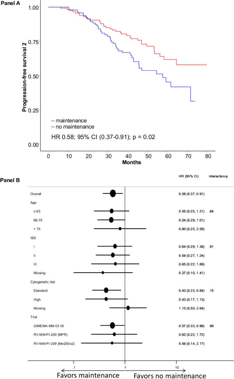Results: Overall, 213 patients obtained CR after induction/consolidation, 118 received maintenance and 95 no maintenance. In patients achieving CR, maintenance significantly improved PFS1 (HR 0.50, P < 0.001), PFS2 (HR 0.58, P 0.02) and OS (HR 0.51, P 0.02) compared with no maintenance; the advantage was maintained across all the analyzed subgroups according to age, International Staging System (ISS) stage, cytogenetic profile and treatment. Similar features were seen in VGPR/PR patients.