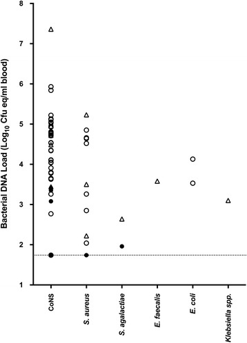 Results: In total, 91 episodes of suspected sepsis were investigated, and PCR was positive in 53 (58%) and blood culture in 60 (66%) episodes, yielding no significant difference in detection rate (p = 0.17). Multiplex PCR showed a sensitivity of 77%, specificity of 81%, positive predictive value of 87%, and negative predictive value of 68% compared with blood culture. Episodes with discordant results of PCR and blood culture included mainly detection of coagulase-negative staphylococci (CoNS). C-reactive protein (CRP) level and immature to total neutrophil (I/T) ratio were lower in these episodes, indicating less severe disease or even contamination. Median BDL was high (4.1 log10 cfu Eq/ml) with a wide range, and was it higher in episodes with a positive blood culture than in those with a negative blood culture (4.5 versus 2.5 log10 cfu Eq/ml; p < 0.0001). For CoNS infection episodes BDL and CRP were positively associated (p = 0.004), and for Staphylococcus aureus infection episodes there was a positive association between BDL and I/T ratio (p = 0.049).