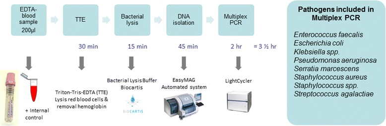 Background: Rapid and accurate diagnosis of neonatal sepsis is highly warranted because of high associated morbidity and mortality. The aim of this study was to evaluate the performance of a novel multiplex PCR assay for diagnosis of late-onset sepsis and to investigate the value of bacterial DNA load (BDL) determination as a measure of infection severity.
