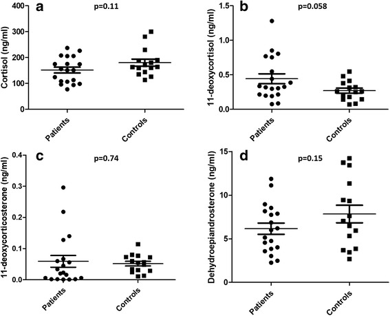Methods: Nineteen patients (14 women) with MS receiving oral fingolimod (Gilenya®, Novartis) therapy were included. Median age was 34.2 years (range; 21.3-44.6 years). Median duration of fingolimod treatment was 32 months (range; 6-52 months) at a dose of 0.5 mg/day. Basal and ACTH-stimulated adrenal steroid measurements were evaluated simultaneously employing LC-MS/MS based steroid panel. Basal steroid concentrations were also compared to that of sex- and age-matched healthy subjects. Cortisol and 11-deoxycortisol, 11-deoxycorticosterone and dehydroepiandrosterone were used to assess glucocorticoid, mineralocorticoid and sex steroid producing pathways, respectively.