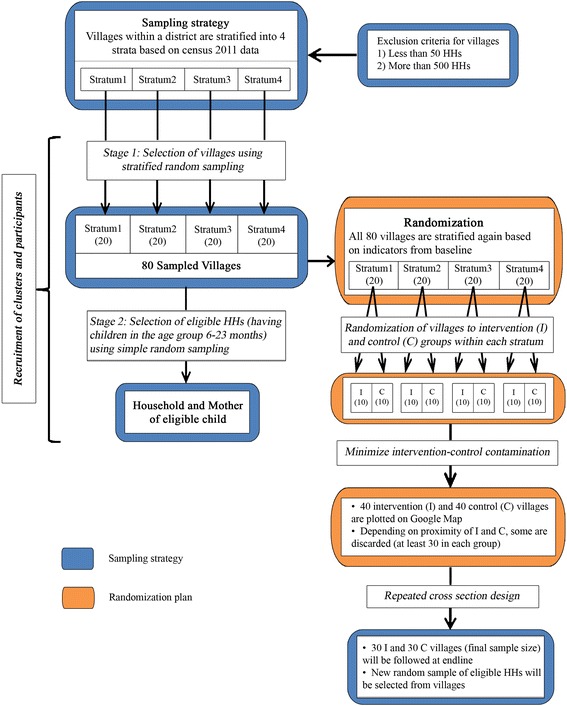 Methods/design: We adopt a cluster randomized design with two groups to evaluate the intervention in Assam, a state in the northeast region of India. To recruit villages and participants at baseline, we used a two-stage stratified random sampling method. We stratified villages; our unit of randomization, based on census data and randomly selected villages from each of the four strata. At the second-stage, we selected random sub-sample of eligible households (having children in the age group of 6-23 months) from each selected village. The study uses a repeated cross sectional design where we track the same sampled villages but draw independent random samples of households at baseline and endline. Total number of villages required for the study is 180 with 15 eligible HHs from each village. Post-baseline survey, we adopt a stratified randomization strategy to achieve better balance in intervention and control groups, leveraging information from the extensive baseline survey.