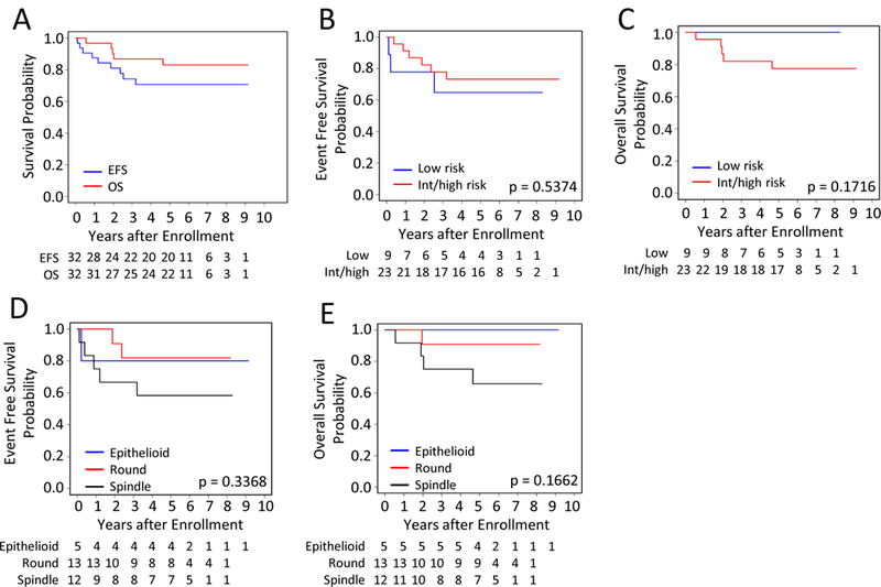 Purpose: A comprehensive analysis of the genomics of undifferentiated sarcomas (UDS) is lacking. We analyzed copy-number alterations and fusion status in patients with UDS prospectively treated on Children's Oncology Group protocol ARST0332.Experimental Design: Copy-number alterations were assessed by OncoScan FFPE Express on 32 UDS. Whole-exome and transcriptome libraries from eight tumors with sufficient archived material were sequenced on HiSeq (2 × 100 bp). Targeted RNA-sequencing using Archer chemistry was performed on two additional cases.Results: Five-year overall survival for patients with UDS was 83% (95% CI, 69%-97%) with risk-adapted therapy (surgery, chemotherapy, and radiotherapy). Both focal and arm-level copy-number alterations were common including gain of 1q (8/32, 25%) and loss of 1p (7/32, 22%), both of which occurred more often in clinically defined high-risk tumors. Tumors with both loss of 1p and gain of 1q carried an especially poor prognosis with a 5-year event-free survival of 20%. GISTIC analysis identified recurrent amplification of FGF1 on 5q31.3 (q = 0.03) and loss of CDKN2A and CDKN2B on 9p21.3 (q = 0.07). Known oncogenic fusions were identified in eight of 10 cases analyzed by next-generation sequencing.Conclusions: Pediatric UDS generally has a good outcome with risk-adapted therapy. A high-risk subset of patients whose tumors have copy-number loss of 1p and gain of 1q was identified with only 20% survival. Oncogenic fusions are common in UDS, and next-generation sequencing should be considered for children with UDS to refine the diagnosis and identify potentially targetable drivers. Clin Cancer Res; 24(16); 3888-97. ©2018 AACR.