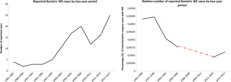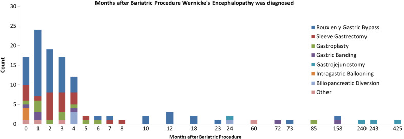 Half a million bariatric procedures are performed annually worldwide. Our aim was to review the signs and symptoms of Wernicke's encephalopathy (WE) after bariatric surgery. We included 118 WE cases. Descriptions involved gastric bypass (52%), but also newer procedures like the gastric sleeve. Bariatric WE patients were younger (median = 33 years) than those in a recent meta-analysis of medical procedures (mean = 39.5 years), and often presented with vomiting (87.3%), ataxia (84.7%), altered mental status (76.3%), and eye movement disorder (73.7%). Younger age seemed to protect against mental alterations and higher BMI against eye movement disorders. The WE treatment was often insufficient, specifically ignoring low parenteral thiamine levels (77.2%). In case of suspicion, thiamine levels should be tested and treated adequately with parenteral thiamine supplementation.