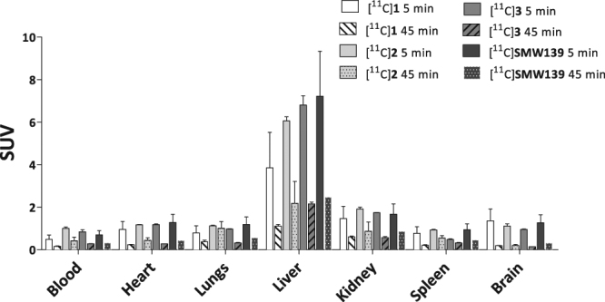 The P2X7 receptor plays a significant role in microglial activation, and as a potential drug target, the P2X7 receptor is also an interesting target in positron emission tomography. The current study aimed at the development and evaluation of a potent tracer targeting the P2X7 receptor, to which end four adamantanyl benzamide analogues with high affinity for the human P2X7 receptor were labelled with carbon-11. All four analogues could be obtained in excellent radiochemical yield and high radiochemical purity and molar activity, and all analogues entered the rat brain. [11C]SMW139 showed the highest metabolic stability in rat plasma, and showed high binding to the hP2X7 receptor in vivo in a hP2X7 receptor overexpressing rat model. Although no significant difference in binding of [11C]SMW139 was observed between post mortem brain tissue of Alzheimer's disease patients and that of healthy controls in in vitro autoradiography experiments, [11C]SMW139 could be a promising tracer for P2X7 receptor imaging using positron emission tomography, due to high receptor binding in vivo in the hP2X7 receptor overexpressing rat model. However, further investigation of both P2X7 receptor expression and binding of [11C]SMW139 in other neurological diseases involving microglial activation is warranted.