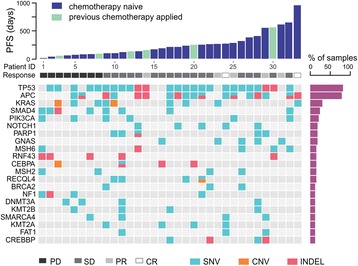 Methods: In this study, we analysed the mutation profiles of 33 Chinese mCRC patients using comprehensive next-generation sequencing (NGS) targeting 416 cancer-relevant genes before cetuximab treatment. Upon receiving cetuximab-based therapy, patients were evaluated for drug response, and the progression-free survival (PFS) was monitored. The association of specific genetic alterations and cetuximab efficacy was analyzed.