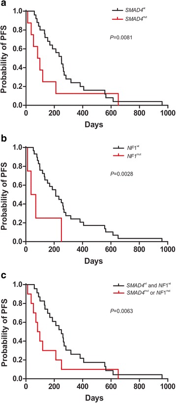 Results: Patients carrying SMAD4 mutations (SMAD4mut, n = 8) or NF1 mutations (NF1mut, n = 4) had significantly shorter PFS comparing to those carrying wildtype SMAD4 (SMAD4wt, n = 25) (P = 0.0081) or wildtype NF1 (NF1wt, n = 29) (P = 0.0028), respectively. None of the SMAD4mut or NF1mut patients showed response to cetuximab when assessed at 12-week post-treatment. Interestingly, two patients carrying both SMAD4mut and NF1mut showed the shortest PFS among all the patients.