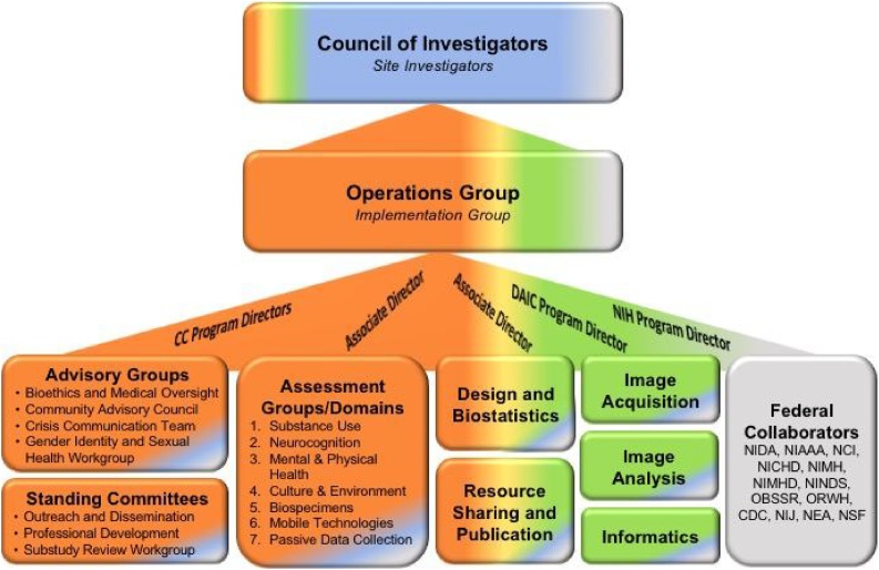 The Adolescent Brain Cognitive Development (ABCD) study is designed to be the largest study of brain development and child health in the United States, performing comprehensive assessments of 11,500 children repeatedly for 10 years. An endeavor of this magnitude requires an organized framework of governance and communication that promotes collaborative decision-making and dissemination of information. The ABCD consortium structure, built upon the Matrix Management approach of organizational theory, facilitates the integration of input from all institutions, numerous internal workgroups and committees, federal partners, and external advisory groups to make use of a broad range of expertise to ensure the study's success.