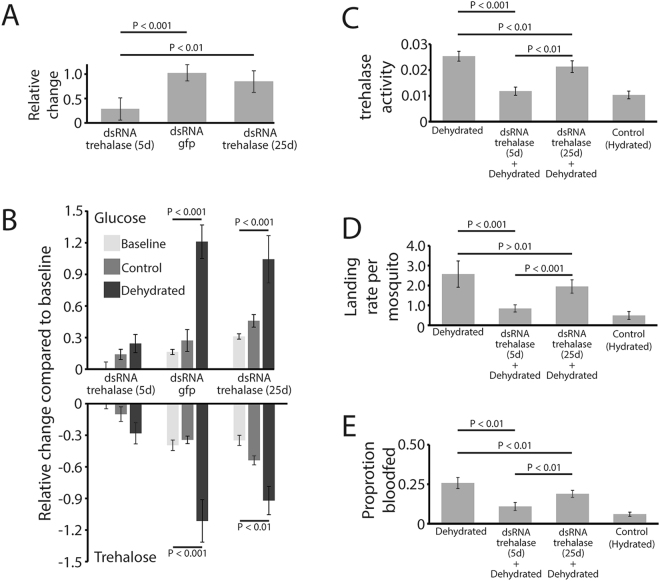 Current insights into the mosquito dehydration response rely on studies that examine specific responses but ultimately fail to provide an encompassing view of mosquito biology. Here, we examined underlying changes in the biology of mosquitoes associated with dehydration. Specifically, we show that dehydration increases blood feeding in the northern house mosquito, Culex pipiens, which was the result of both higher activity and a greater tendency to land on a host. Similar observations were noted for Aedes aegypti and Anopheles quadrimaculatus. RNA-seq and metabolome analyses in C. pipiens following dehydration revealed that factors associated with carbohydrate metabolism are altered, specifically the breakdown of trehalose. Suppression of trehalose breakdown in C. pipiens by RNA interference reduced phenotypes associated with lower hydration levels. Lastly, mesocosm studies for C. pipiens confirmed that dehydrated mosquitoes were more likely to host feed under ecologically relevant conditions. Disease modeling indicates dehydration bouts will likely enhance viral transmission. This dehydration-induced increase in blood feeding is therefore likely to occur regularly and intensify during periods when availability of water is low.