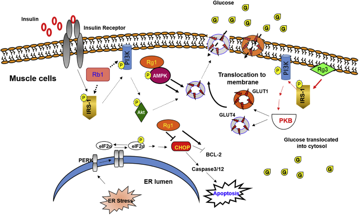 Ginseng has gained its popularity as an adaptogen since ancient days because of its triterpenoid saponins, known as ginsenosides. These triterpenoid saponins are unique and classified as protopanaxatriol and protopanaxadiol saponins based on their glycosylation patterns. They play many protective roles in humans and are under intense research as various groups continue to study their efficacy at the molecular level in various disorders. Ginsenosides Rb1 and Rg1 are the most abundant ginsenosides present in ginseng roots, and they confer the pharmacological properties of the plant, whereas ginsenoside Rg3 is abundantly present in Korean Red Ginseng preparation, which is highly known for its anticancer effects. These ginsenosides have a unique mode of action in modulating various signaling cascades and networks in different tissues. Their effect depends on the bioavailability and the physiological status of the cell. Mostly they amplify the response by stimulating phosphotidylinositol-4,5-bisphosphate 3-kinase/protein kinase B pathway, caspase-3/caspase-9-mediated apoptotic pathway, adenosine monophosphate-activated protein kinase, and nuclear factor kappa-light-chain-enhancer of activated B cells signaling. Furthermore, they trigger receptors such as estrogen receptor, glucocorticoid receptor, and N-methyl-d-aspartate receptor. This review critically evaluates the signaling pathways attenuated by ginsenosides Rb1, Rg1, and Rg3 in various tissues with emphasis on cancer, diabetes, cardiovascular diseases, and neurodegenerative disorders.