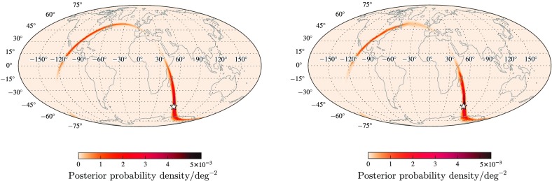 Posterior probability density for sky location for an example simulated binary neutron star…
