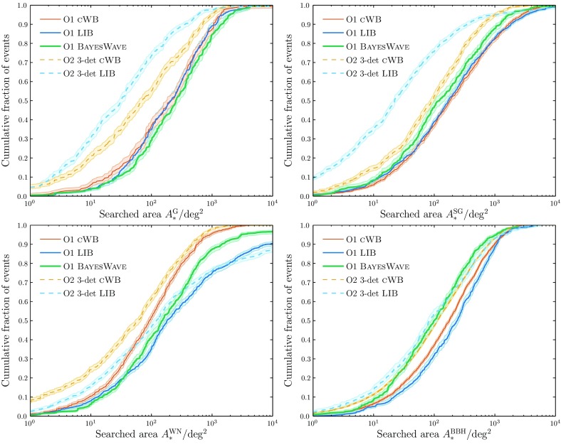Simulated sky localization for Gaussian (G; top left ), sine–Gaussian (SG; top right …