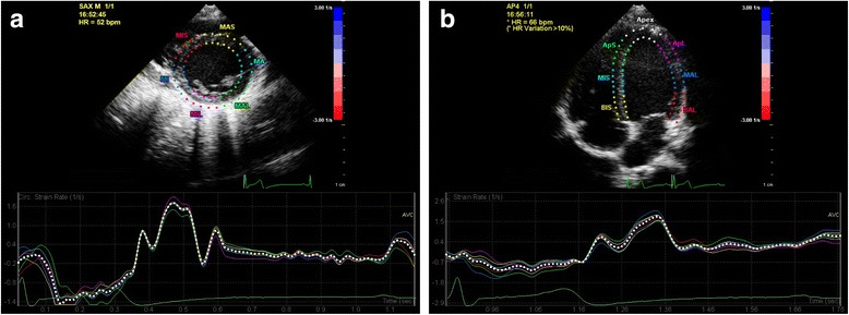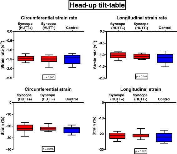 Results: Conventional echocardiographic parameters were similar in all analyzed groups. When compared to healthy controls, children with NS had depressed levels of circumferential strain rate (p = 0.032) and significantly depressed longitudinal strain rate (p < 0.001) at rest. Interestingly, during HUTT testing LV global strain and strain rate were similar in both groups. LV strain rate was lowest in HUTT+ followed by HUTT- and control subjects both at rest and during HUTT.